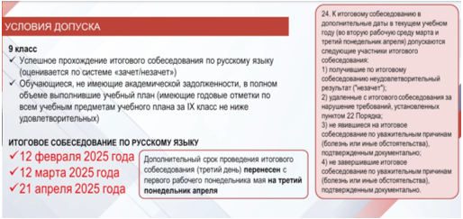 Согласно Порядку проведения государственной итоговой аттестации по образовательным программам основного общего образования к ГИА допускаются обучающиеся, не имеющие академической задолженности, в полном объеме выполнившие учебный план или индивидуальный учебный план (имеющие годовые отметки по всем учебным предметам учебного плана за IX класс не ниже удовлетворительных), а также имеющие результат «зачет» за итоговое собеседование по русскому языку.