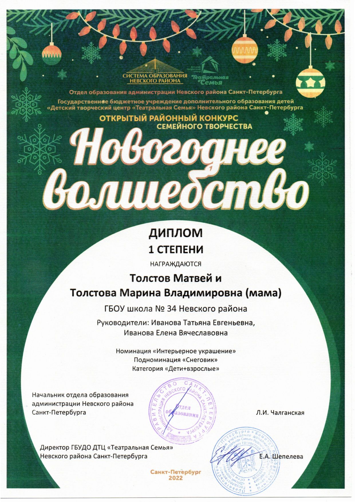 Лауреатом в номинации «Лучший развивающий класс» (учебный кабинет, помещение для реализации программ дополнительного образования) Лауреатом стала ГБОУ школа №34 Невского района Санкт-Петербурга, которую представляла Заслуженный учитель Российской Федерации, директор школы Сергеева Татьяна Александровна.