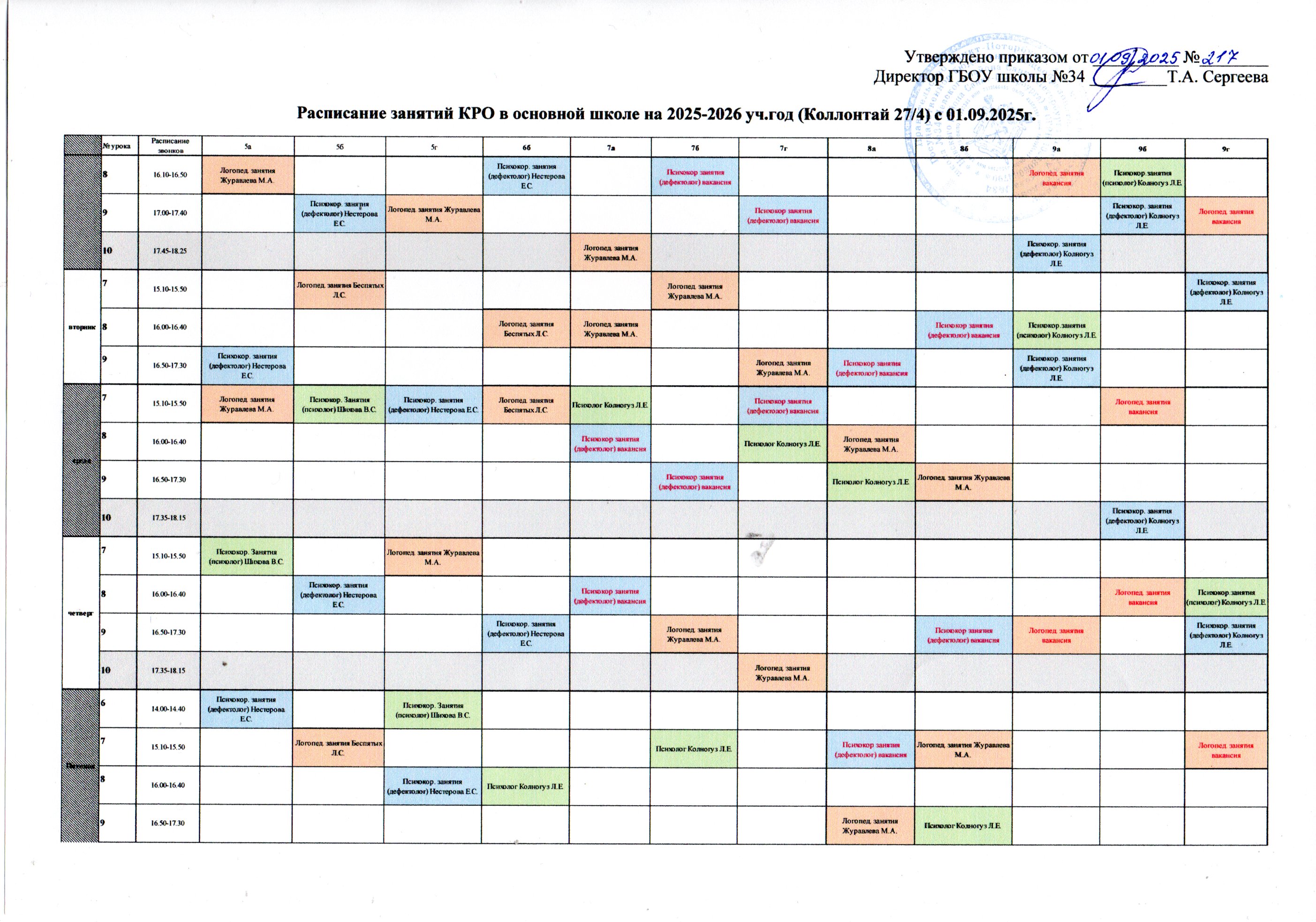 Расписание ВНД осн школа Коллонтай